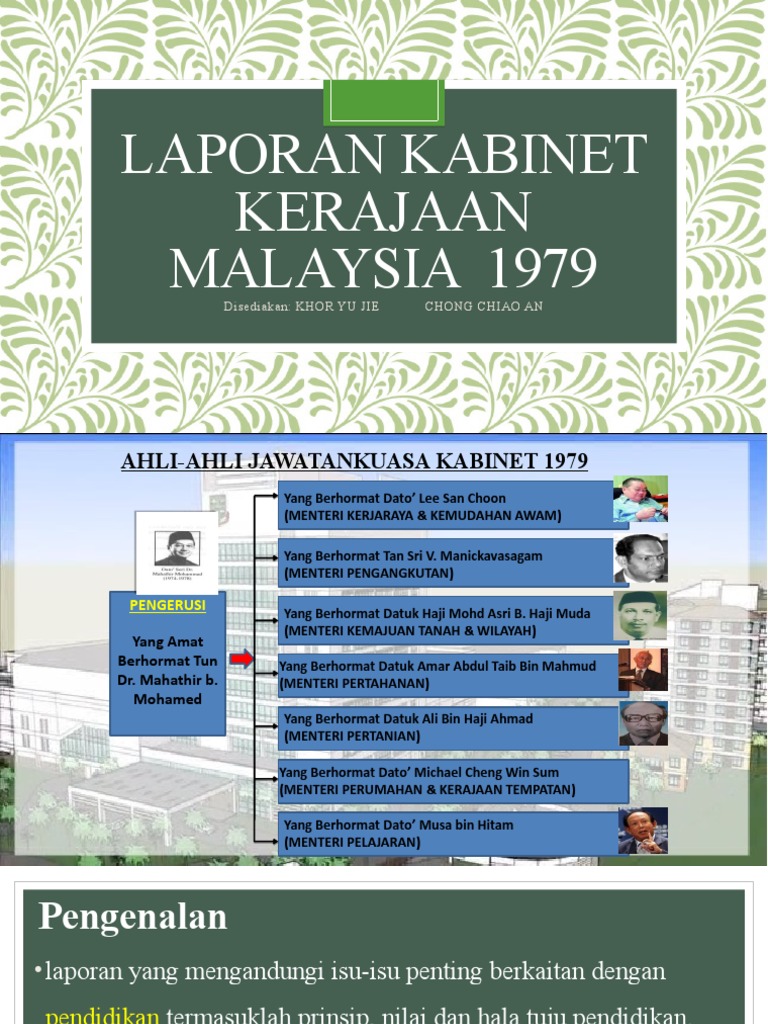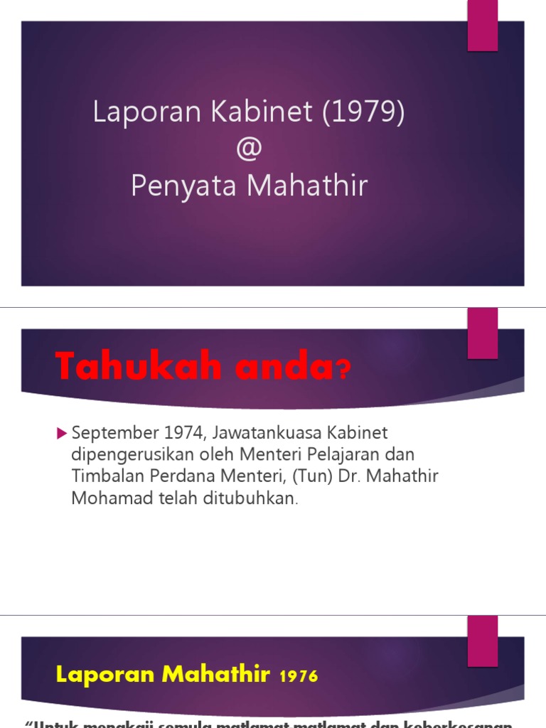 Laporan Jawatankuasa Kabinet from image.slidesharecdn.com Laporan kabinet (1979) @ penyata mahathir. Mahathir mohamad ketika beliau menyandang jawatan timbalan perdana menteri malaysia pada tahun 1979. Matlamat tersebut telah meletakkan satu. Bidang ini selaras dengan perakuan dalam laporan jawatankuasa kabinet 1979. 2) tumpuan kepada sumber manusia yang berkemahiran demi kemajuan dan pembangunan negara. Agong kemudian akan bertindak atas nasihat kerajaan. ~ perakuan 2a, laporan jawatankuasa kabinet. Perakuan 191, laporan jawatankuasa kabinet, 1979.